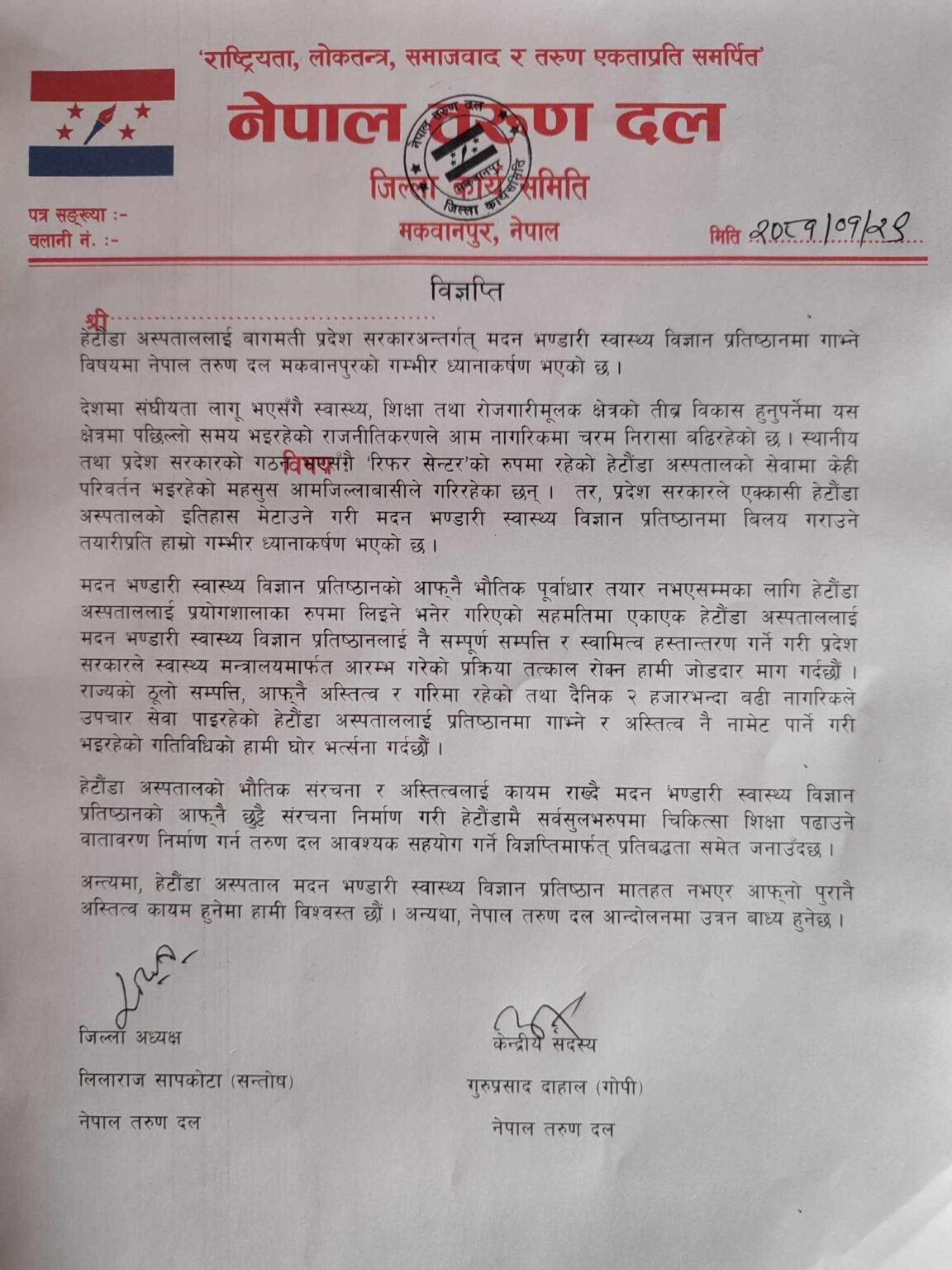 नेपाल तरुण दल जिल्ला अध्यक्ष लिलाराज सापकोटा (सन्तोष) र तरुण केन्द्रीय सदस्य गुरुप्रसाद दाहाल (गोपी) ले संयुक्त रुपमा विज्ञप्ति जारी गर्दै स्थानीय तथा प्रदेश सरकारको गठन भएसँगै ‘रिफर सेन्टर’को रुपमा रहेको हेटौंडा अस्पतालको सेवामा केही परिवर्तन भइरहेको अवस्थामा प्रदेश सरकारले एक्कासी हेटौंडा अस्पतालको इतिहास मेटाउने गरी प्रतिष्ठानमा विलय गराउने तयारीप्रति ध्यानाकर्षण भएको जनाएको हो ।