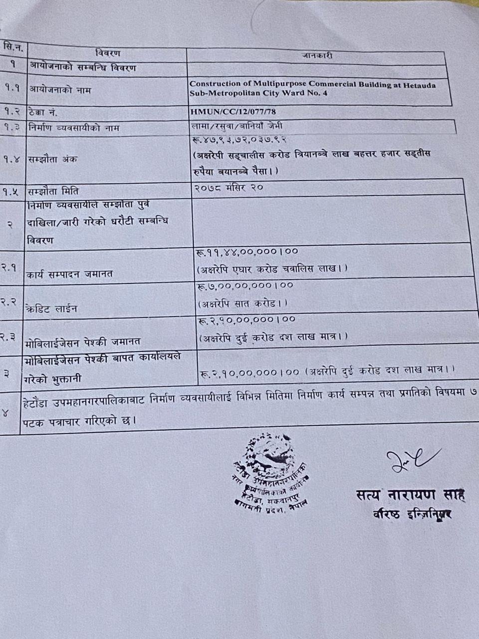 भवन निर्माण सम्झौता गर्दा निर्माण कम्पनीको तर्फ बाट लामा/रसुवा जेभी बाट ऋषिराज बानियाँ र बानियाँ निर्माण सेवाको तर्फ बाट अनिल थापा क्षेत्रीले हस्ताक्षर गरेका थिए । निर्माण कम्पनिले मोबिलाइजेशन बापत ठुलो रकम भुक्तानी लगेको बर्षौ हुदाँ समेत काम नगरे पछी निर्माण कम्पनिलाइ तत्काल कार्य सुरु गर्न हेटौडा उपमहानगरपालिकाले हाल सम्म ७ पटक पत्राचार गरि सकेको भए पनि निर्माण कम्पनीले काम भने सुरु गरेको छैन । मोबिलाइजेसन रकम पनि लाने निर्माणको काम पनि नगर्ने भन्दै जनस्तर बाट बिरोध हुन् थालेको भए पनि बानियाँ/लामा/रसुवा जेभीले कुनै प्रतिक्रिया दिएको छैन । यहि मसिर २१ गते सम्म निर्माण कम्पनीको समय रहेको र उक्त मिति सम्म काम सम्पन्न नगरे उपमहानगरपालिकाले कानुन बमोजिम गर्ने चेतावनी निर्माण कम्पनिलाई दिदै आएको नगरपालिका श्रोतले बताएको छ ।