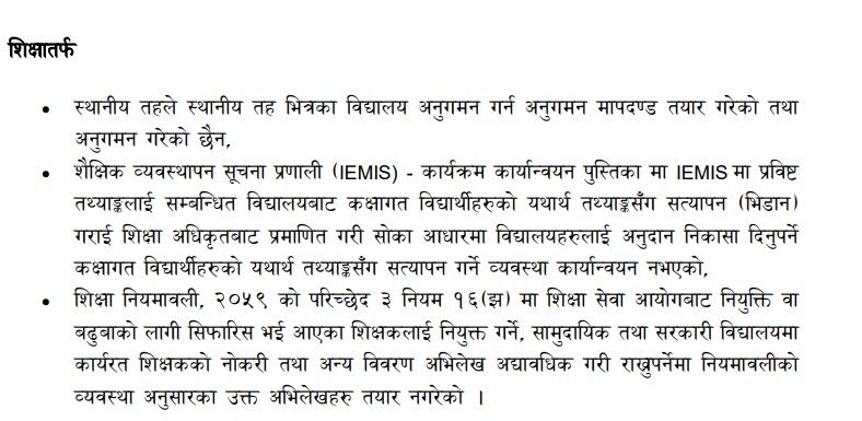 पालिकाले पालिका भित्र रहेका सामुदायिक बिद्यालयमा ठुलो रकम खर्च गरेको भए पनि शैक्षिक् गुणस्तर देखि बिद्यालय अनुगमन जस्ता कार्यमा पालिका बेखबर रहेको, शिक्षक् सरुवा बढुवामा समेत पालिका जिम्मेवार हुन् नसकेको प्रतिबेदनमा उल्लेख भएको छ । पालिकाले करारमा कर्मचारी भर्ति गर्दा समेत अनियमितता गरेको, स्थानीय सरकार संचालन ऐन २०७४ दफा ८३(८) मा स्थानीयतहले नगर प्रहरी, सवारी चालक, सयास,माली, चौकीदार, प्लम्बर, बगैचा सफा गर्ने र कार्यालय सहयोगी बाहेक कर्मचारी करारमा राख्न नपाइने ब्यबस्था गरेको भए पनि पालिकाले १७ जना अन्य क्षेत्रका कर्मचारी भर्ति गरि अन्ठाउन्न लाख ८५ हजार बढी रकम अनियमितता गरेको पाहिएको छ ।