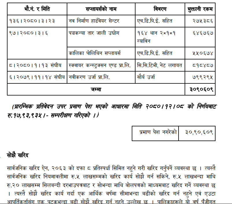 पालिकाले सार्वजनिक खरिद नियमावली लाइ समेत धज्जी उडाउदै मनोपोली तरिकाले कार्यकर्ता रिजाउने जस्ता कार्य गरेको साथै निर्माण कम्पनीले पालिका अन्तरगत गरेका कामको गुणस्तर यकिन नगरी सोझै भुक्तानी दिएको, पालिका भित्र सम्पन्न भएका बिकाश निर्माणको कार्य उपभोक्ता समिति लाइ समेत हस्तान्तरण गर्न सकेको छैन काम सम्पन्न भएको र बजेट निकासा हुदाँ समेत पालिकाले उपभोक्ता समिति लाइ योजाना हस्तान्तरण नगर्नुले पालिकाको बिकाश निर्माण योजनामा समेत कैफियत हुन् सक्ने आशंका उब्जिएको छ ।