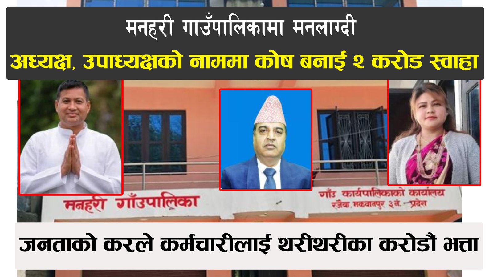 मकवानपुरको मनहरी गाउँपालिकामा करोडौं अनियमितता भएको महालेखा परीक्षकको कार्यालयको प्रतिवेदनले देखाएको छ । महालेखाको गएको आर्थिक वर्षको प्रतिवेदनअनुसार गाउँपालिकामा शीर्षक फरक पारी रकम खर्च गरेको, अवण्डा बजेट राखी करोडौ रकम खर्च गरेको, अनुदान तथा किसानका नाममा लाखौं अनियमितता भएको, पदाधिकारीहरूलाई नियम विपरित मनलाग्दी भत्ता बाँडेकोलगायतका कुराहरुमा महालेखाले प्रश्न उठाएको हो ।
