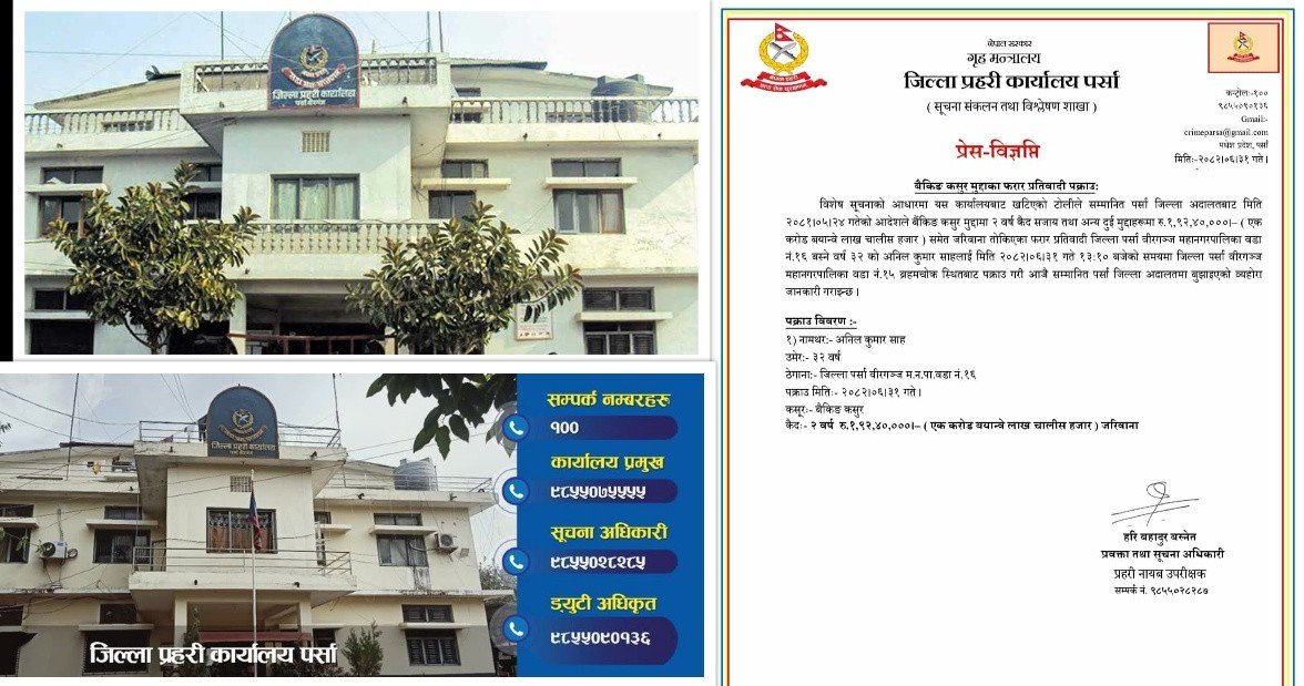 बैंकिङ्ग कसुर मुद्धाका फरार प्रतिवादी पर्सा जिल्ला वीरगन्ज महानगरपालिका १६ बस्ने अनिल कुमार साहलाई पक्राउ गरेको जिल्ला प्रहरी कार्यालय पर्साका सुचना अधिकारि हरि बहादुर बस्नेतले जानकारी दिनु भएको हो ।